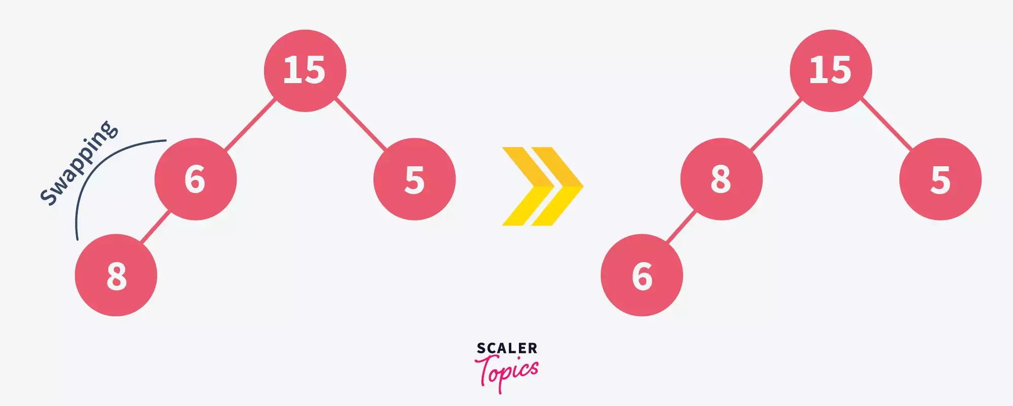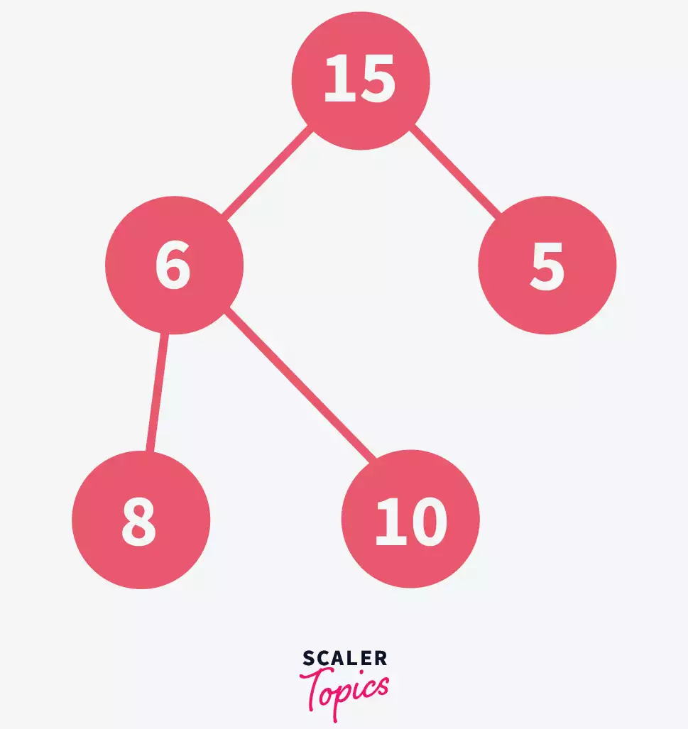The provided image shows a min-heap example: the root 5 is smaller than its children 8 and 6, and node 8 is smaller than its children 10 and 15, confirming the min-heap structure.