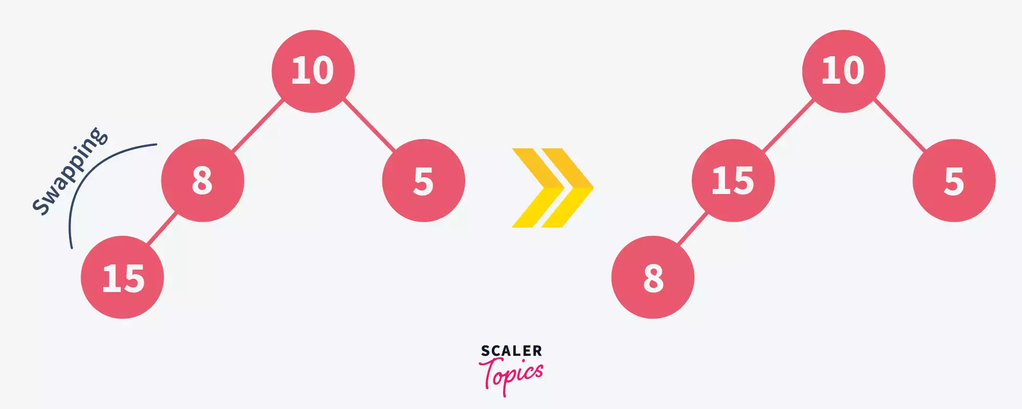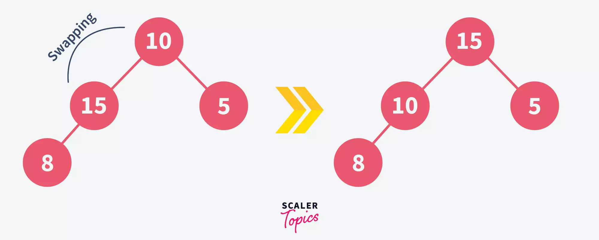 - Search for the element to be deleted and swap it with the last element in the heap, let’s say we want to delete 10-